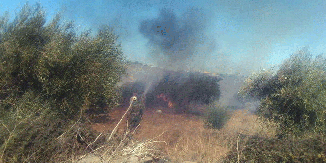 أخمد عناصر الدفاع المدني في محافظة حمص اليوم بالتعاون مع الأهالي حريقاً اندلع في أعشاب يابسة وأشجار زيتون في الأراضي الزراعية لبلدة جب البستان بريف حمص الغربي.