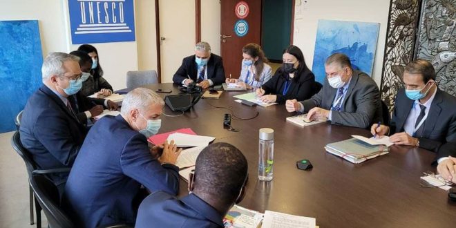 وفي السياق نفسه ناقش الوفد السوري الذي يترأسه وزير التربية رئيس اللجنة الوطنية السورية للتربية والثقافة والعلوم الدكتور دارم طباع خلال اجتماعه مع مساعد المدير العام لليونسكو لشؤون الثقافة ارنستو أورتون تأمين الدعم الدولي اللازم لإعادة تأهيل المناطق الأثرية وإعادة الآثار المسروقة والاهتمام بالتراث اللامادي.