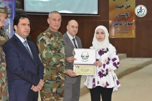 وفي الختام تم توزيع الشهادات التقديرية والهدايا الرمزية على الطلاب المتفوقين، الذين أكدوا أنهم عازمون على مواصلة طريق التفوق والنجاح ليكونوا دائماً عند حسن الظن بهم ويسهموا في بناء سورية المجد والبطولة والفخار.