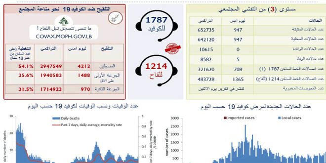 وسجل لبنان أمس 6 حالات وفاة و1133 إصابة بالفيروس.