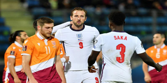 تأهل المنتخب الإنكليزي إلى نهائيات كأس العالم 2022 بعد فوزه على مضيفه منتخب سان مارينو بعشرة أهداف دون رد في المباراة التي جمعتهما في ختام مباريات المجموعة التاسعة بالتصفيات الأوروبية.