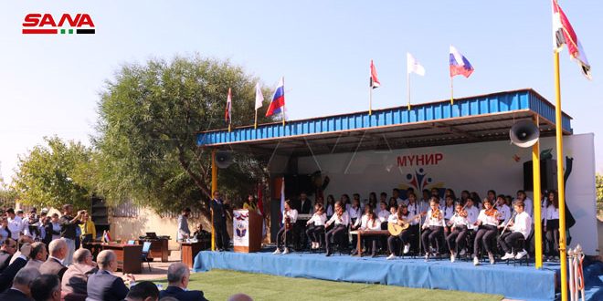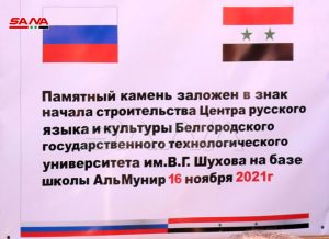ضمن برنامج أعمال الاجتماع السوري الروسي المشترك لمتابعة أعمال المؤتمر الدولي حول عودة اللاجئين السوريين الذي يعقد حالياً في قصر المؤتمرات بدمشق تم اليوم في مدرسة المنير الخاصة بمحافظة اللاذقية وضع حجر الأساس لبناء مركز تعليم اللغة الروسية لمرحلة ما بعد الثانوية في إطار التعاون بين جامعة بيلوغرود الروسية للتكنولوجيا والعلوم ومدرسة المنير.