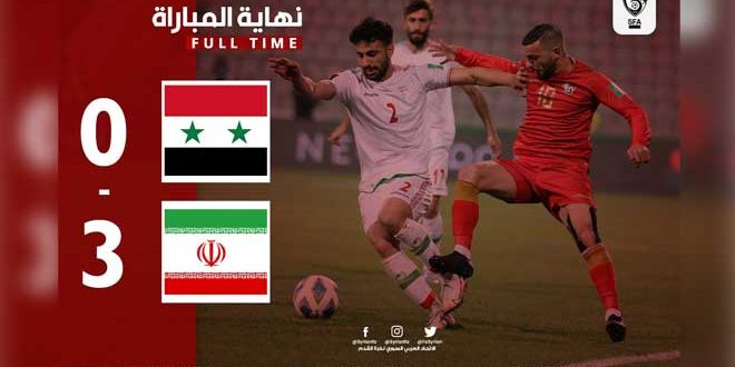 خسر منتخب سورية لكرة القدم للرجال أمام نظيره الإيراني بثلاثة أهداف دون رد في المباراة التي جمعتهما اليوم على ملعب القويسمة في الأردن ضمن الدور الحاسم لتصفيات كأس العالم.