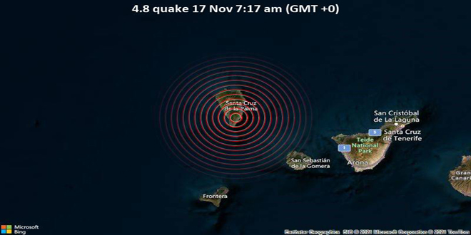 ضربت هزة أرضية بقوة 8ر4 درجات على مقياس ريختر اليوم جزيرة لا بالما الإسبانية في المحيط الأطلسي.