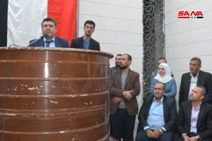 معتز أبو النصر جمران محافظ ريف دمشق أوضح في كلمته أن مدينة دوما تمثل اللؤلؤة للمحافظة وكانت هي السلة الغذائية الاساسية للعاصمة فضلا عن ارثها الثقافي والفكري ومشاركتها في النضال ضد الاحتلال الفرنسي ومواقف أبنائها الوطنية المشرفة.
