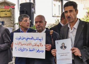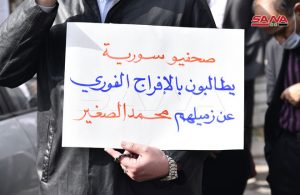 نفذ اتحاد الصحفيين اليوم وقفة تضامنية مع الصحفي محمد الصغير مراسل الاخبارية السورية المختطف لدى ميليشيا “قسد” المدعومة من قوات الاحتلال الأمريكي منذ حزيران عام 2019 والذي تدهورت حالته الصحية بشكل يؤثر على حياته نتيجة التعذيب الذي تعرض له في السجن.