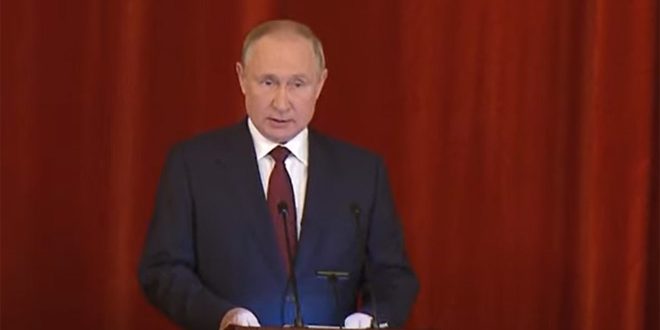 وقال بوتين في خطاب ألقاه اليوم أثناء اجتماع موسع عقد في مقر وزارة الخارجية الروسية إن “روسيا شاركت بشكل مباشر في القضاء على الإرهاب الدولي في سورية وإعادة إطلاق عملية حل الأزمة فيها تحت رعاية الأمم المتحدة ضمن إطار صيغة أستانا بالتعاون مع الدول الضامنة”.