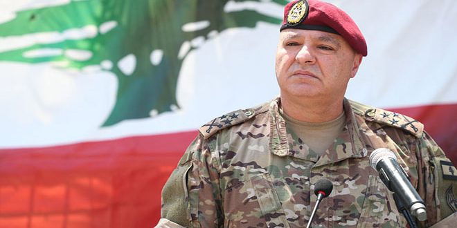 أكد قائد الجيش اللبناني العماد جوزيف عون أن التصدي للعدو الإسرائيلي ومواجهته من خلال الجهوزية واليقظة وملاحقة الخلايا الإرهابية والقضاء عليها رسخ دعائم الاستقلال في لبنان.