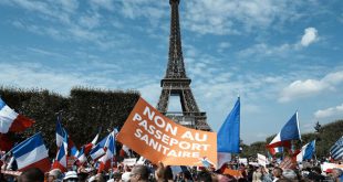 وشارك في الاحتجاجات التي قدرت بالآلاف معارضو التطعيم الإلزامي ضد فيروس كورونا إلى جانب أنصار حركة السترات الصفراء.