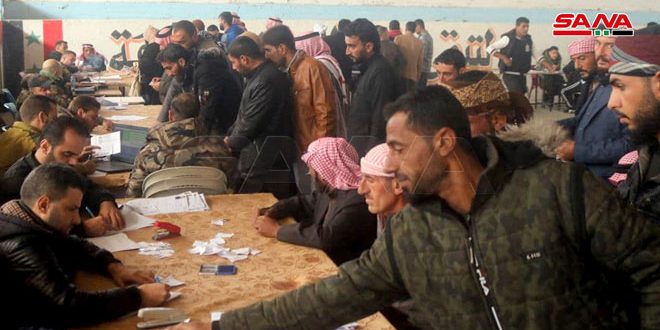 ويتواصل لليوم السابع على التوالي توافد المدنيين المطلوبين والعسكريين الفارين والمتخلفين عن الخدمتين الإلزامية والاحتياطية من أبناء دير الزور الذين قدموا من المحافظة ومن مناطق مختلفة من الجزيرة السورية للانضمام إلى التسوية الشاملة الخاصة بأبناء المحافظة.