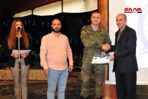 حضر حفل التكريم اللواء بسام بري مدير مديرية الشهداء والجرحى والمفقودين والعقيد الكسي سافينكوف رئيس المركز الروسي للمصالحات والرائد ديانا بوغوسيان من المركز الروسي.