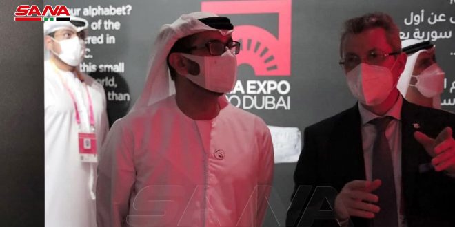 زار وفد إماراتي يرأسه وزير التربية والتعليم حسين الحمادي جناح سورية في معرض إكسبو 2020 دبي وجال في أقسامه واطلع على المعروضات الفنية والثقافية المتنوعة فيه من الأبجدية الأولى إلى الغرفة المخصصة للاستماع إلى أقدم تدوين موسيقي في التاريخ.