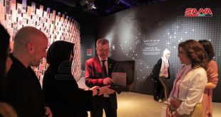 وأبدى الوفد الزائر إعجاباً كبيراً بالمعرض الفني الجماعي الذي يستضيفه الجناح تحت عنوان “أنا السوري” حيث تمثل كل لوحة معروضة فيه وجهاً من سورية.