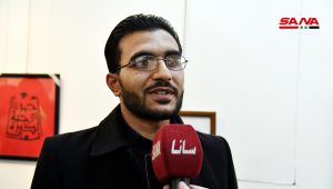 الخطاط الشاب حذيفة العلي شارك بلوحة بالخطين الكوفي والديواني منوها بدور المهرجان بمساعدة الفنانين الشباب على التعريف بأعمالهم وزيادة ثقافتهم البصرية والاطلاع على أعمال الخطاطين الكبار في هذا المجال.