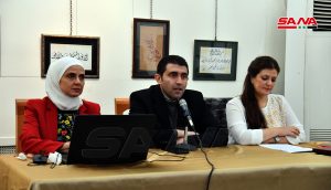 الفنانة التشكيلية ريم قبطان رئيسة جمعية بيت الخط العربي والفنون تناولت خلال الجلسة محور الزخرفة والتذهيب ودورهما في تجميل المخطوطات والكتب مركزة على أنواع هذه الزخارف وتنوعها بحسب ثقافات البلدان الإسلامية التي استخدمتها مشيرة إلى أن الزخرفة ارتبطت بفنون الخط العربي وكان لها وظيفة جمالية للمخطوطات فضلاً عن عملية ضبط النص وأحكامه من أي تزوير.