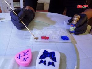 ورغم ما يستلزمه عمل حازم من دقة وجهد فإنه يصمم العديد من القطع ويوظف أفكاره فيها ويسوقها كما بين عبر وسائل التواصل الاجتماعي والمعارف والأصدقاء مع استعداده حالياً للمشاركة بأحد المعارض وخاصة بعد توسيع نطاق عمله وتنويعه بحيث يصنع أيضاً المسابح والإكسسوارات من الخرز والمعدن لافتاً إلى أن المادة الأولية السائلة الشفافة لمشروعه تتطلب حذراً في التعامل معها قبيل تصنيعها حيث يرتدي الكمامة والقفاز أثناء خلطها ووضعها بقوالب لمدة 12 ساعة ثم تركها 48 ساعة لتصل للصلابة المطلوبة ليقوم بعدها بإضافة الألوان إليها حسب الطلب وإضفاء الرتوشات النهائية لتصبح قطعاً جاهزة للبيع.