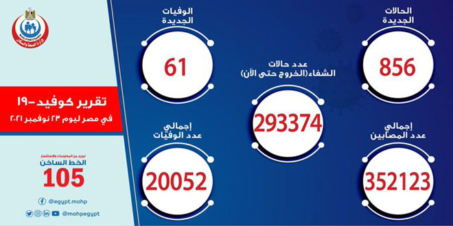 وأوضح المتحدث باسم الوزارة الدكتور حسام عبد الغفار فى بيان أن إجمالي الإصابات بفيروس كورونا في البلاد وصل لغاية الآن إلى 352123 إصابة وإجمالي الوفيات إلى 20052 حالة.