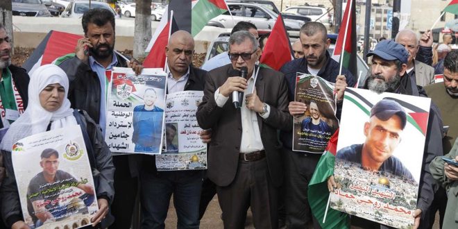 طالب عشرات الفلسطينيين خلال وقفة تضامنية في مدينة رام الله بالضفة الغربية اليوم بتسليم جثامين الشهداء التي تحتجزها سلطات الاحتلال الإسرائيلي مؤكدين أن استمرار احتجاز تلك الجثامين جريمة حرب وانتهاك لحقوق الإنسان والمواثيق الدولية.