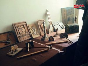 بدوره لفت الفنان أحمد رمضان العلي المشرف على تدريب الأطفال في المعرض إلى أن المشاركين قدموا أيضاً أدوات لمهن قديمة كالمغزل القديم ومجسمات متنوعة إضافة إلى لوحات لحارات دمشقية ومواقع أثرية في حمص كالقنطرة والسيباط وكنيسة أم الزنار مشغولة بمادة العجمي.