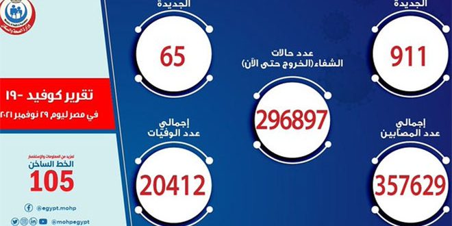 سجلت وزارة الصحة والسكان المصرية 65 حالة وفاة و911 إصابة جديدة بفيروس كورونا خلال الساعات الأربع والعشرين الماضية.