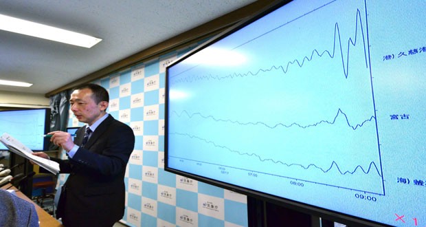 ونقلت رويترز عن محطة تلفزيون ان اتش كيه اليابانية قولها إن أمواجا صغيرة يتراوح ارتفاعها من 10 إلى 20 سنتيمترا وصلت إلى ساحل مقاطعة ايواتي على بعد نحو 600 كيلومتر من طوكيو مضيفة أن أوامر صدرت الى الاف السكان في المنطقة لاخلاء منازلهم.
