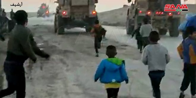 وأفادت مصادر أهلية لمراسلة سانا في ريف الحسكة بأن قوات الاحتلال الأمريكي أطلقت النار في الهواء أثناء اعتراض أهالي قرية الدمخية جنوب مدينة القامشلي رتلاً عسكرياً من 5 عربات ورشقه بالحجارة.