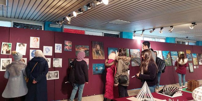 بهدف رعاية الطلاب الموهوبين افتتح في كلية الهندسة المعمارية بجامعة البعث معرض طلابي ضم أكثر من 80 لوحة فنية ومجسما هندسيا.