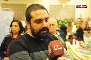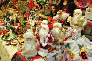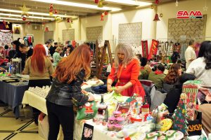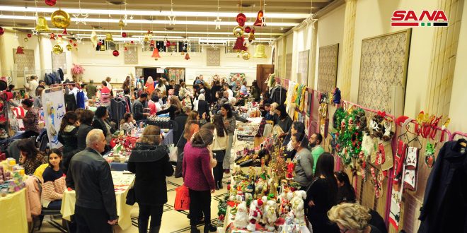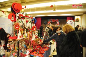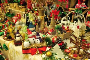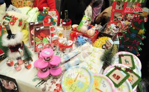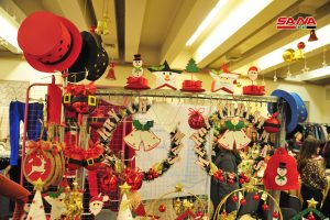 مشغولات يدوية وتحف ولوازم خاصة بعيد الميلاد المجيد يعرضها أكثر من خمسين مشاركاً في البازار الميلادي الخيري الذي افتتح اليوم في كنيسة الصليب المقدس بمنطقة القصاع في دمشق ويستمر حتى الاثنين القادم.
