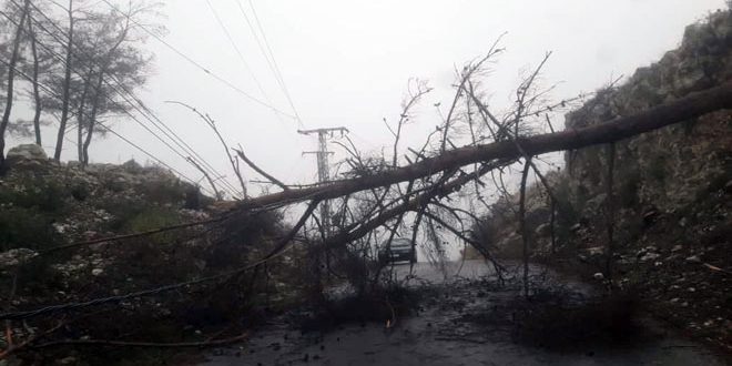 أدت العاصفة المطرية المترافقة برياح شديدة إلى اقتلاع عدد من الأشجار وتساقط الأغصان على الشبكة الكهربائية في نطاق بلدية المعلقة بريف القرداحة باللاذقية وإغلاق الطريق الرئيسي للبلدة.