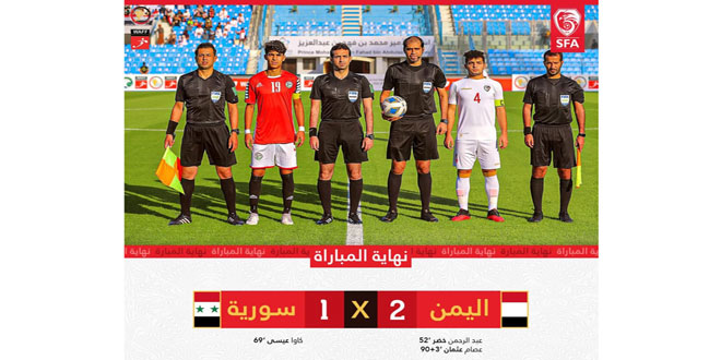 خسر منتخب سورية بكرة القدم أمام نظيره اليمني اليوم بهدف مقابل هدفين في الدور نصف نهائي من بطولة اتحاد غرب آسيا للناشئين المقامة في السعودية.