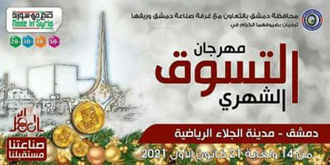 بمشاركة أكثر من 150 شركة محلية تنطلق بعد غد الثلاثاء الدورة الـ 130 من مهرجان التسوق الشهري صنع في سورية الذي تقيمه محافظة دمشق وغرفة صناعة دمشق وريفها في صالة الجلاء الرياضية بدمشق.