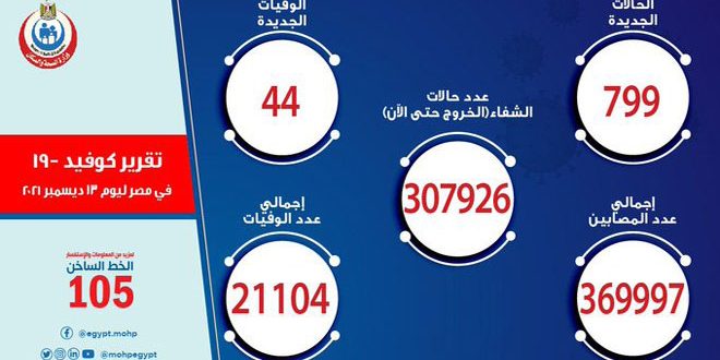 أعلنت وزارة الصحة والسكان المصرية تسجيل 44 حالة وفاة و799 إصابة جديدة بفيروس كورونا خلال الساعات الأربع والعشرين الماضية.