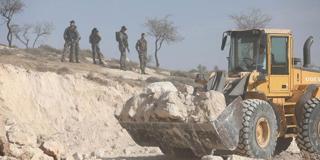 اعتدت قوات الاحتلال الإسرائيلي اليوم على اراضي الفلسطينيين جنوب شرق الخليل في الضفة الغربية وجرفت مساحات واسعة منها واقتلعت عشرات الأشجار.