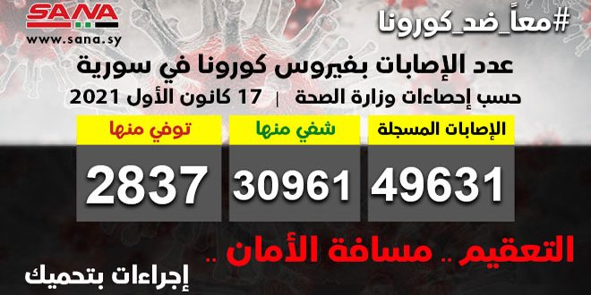 وأوضحت الوزارة في بيان تلقت سانا نسخة منه أن عدد الإصابات المسجلة في سورية بلغ حتى الآن 49631 شفيت منها 30961 حالة وتوفيت 2837 حالة.