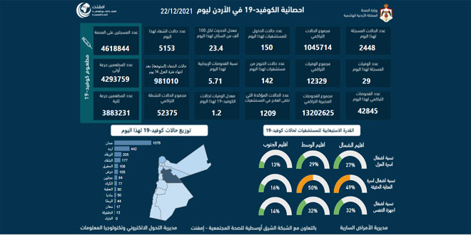 وذكرت الوزارة في بيان لها اليوم أن العدد الاجمالي للوفيات بالفيروس في الأردن بلغ 12329 وفاة والإصابات 1045714 حالة بينما وصل مجموع المتعافين إلى 981010 أشخاص.