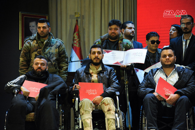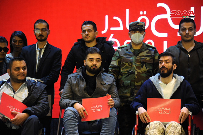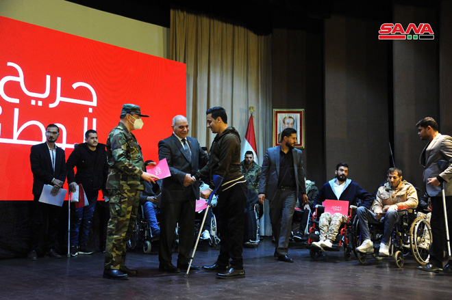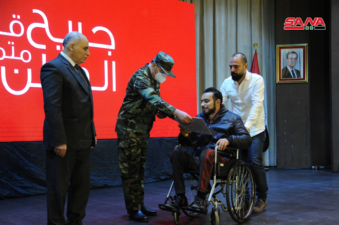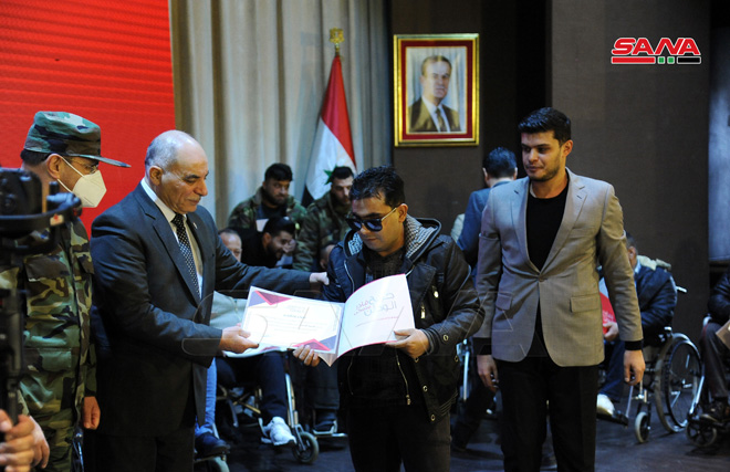 وجرى خلال الحفل الذي أقيم اليوم في نادي ضباط موقع دمشق تكريم 15 جريحاً من جرحى العجز الكلي المتفوقين في الشهادتين الإعدادية والثانوية والمرحلة الجامعية.