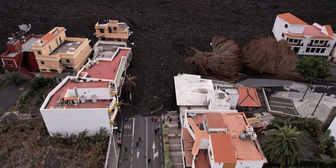 ووفقاً لخدمة إدارة الطوارئ في برنامج كوبرنيكوس التابع للاتحاد الأوروبي تم تدمير نحو 3 آلاف مبنى بسبب الحمم البركانية التي جرفت 1223 هكتاراً من الأراضي.