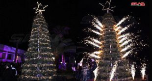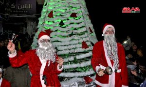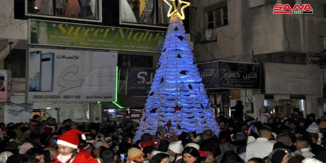 بمناسبة أعياد الميلاد ورأس السنة الجديدة أنارت الفعاليات الأهلية في مدينة سلمية بريف حماة الشرقي مساء اليوم شجرة ميلاد كبيرة في الساحة العامة بالمدينة.