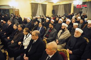 وأكد وزير الأوقاف الدكتور محمد عبد الستار السيد في كلمة له أن أبناء سورية مسلمين ومسيحيين يعيشون أسرة واحدة تسودها المحبة والأخوة والاحترام مشيراً إلى أن سورية بقيت عصية على الإرهاب التكفيري الإخواني والوهابي لأنها تعيش الإسلام والمسيحية الحقيقيين وليس ما يروجه دعاة التطرف والتكفير من فهم خاطئ للإسلام.