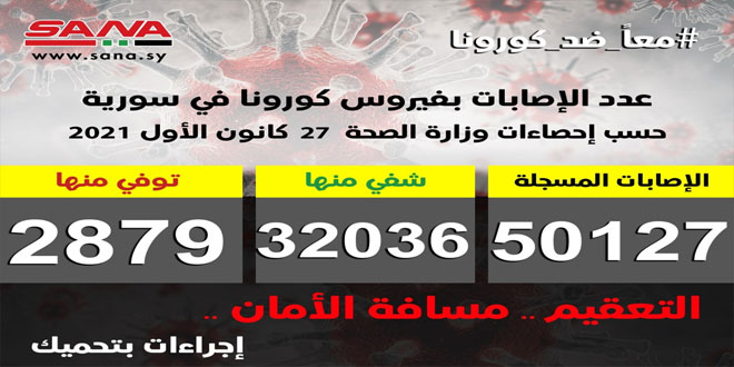 وأوضحت الوزارة في بيان تلقت سانا نسخة منه أن عدد الإصابات المسجلة في سورية بلغ حتى الآن 50127 شفيت منها 32036 حالة وتوفيت 2879 حالة.
