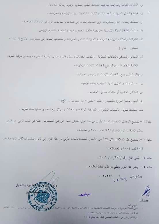 ومن الأعمال التي شملها القرار أيضاً مطاحن القمح والحبوب الأخرى والمعكرونة وتحضير الأعشاب الطبية والتوابل والموالح ومعامل الأعلاف وانتاج الفطر الزراعي ومشاتل الغراس المثمرة والخضار المطعمة ومحطات إكثار الخضراوات وغيرها إضافة إلى مستودعات تخزين ومراكز تحويل وتخزين المخلفات الزراعية “نباتية أو حيوانية” بكل أنواعها ومنشآت بيع اللحوم المبردة والمسالخ والزراعات المحمية والمشاتل النباتية والحراجية بما فيها النباتات العطرية الطبية الزهرية ومراكز تخزينها وقيادة وتشغيل الجرارات والحصادات والآليات الثقيلة والسيارات الزراعية وغيرها.