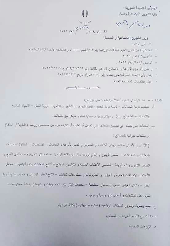 أصدرت وزارة الشؤون الاجتماعية والعمل اليوم قراراً يتضمن الأعمال المرتبطة بالإنتاج الزراعي والتي تخضع بموجبه لتفتيش العمل الزراعي المنصوص عليه في قانون تنظيم العلاقات الزراعية رقم 56 لعام 2004 وتعديلاته.