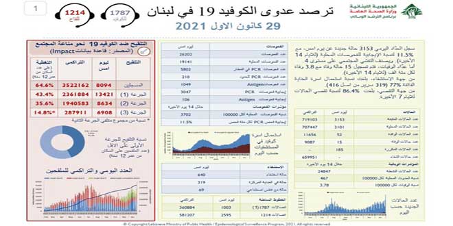 وذكرت الوزارة في تقريرها اليوم أن إجمالي الإصابات بكورونا منذ تفشي الوباء في لبنان ارتفع إلى 719103 والوفيات إلى 9087 حالة.