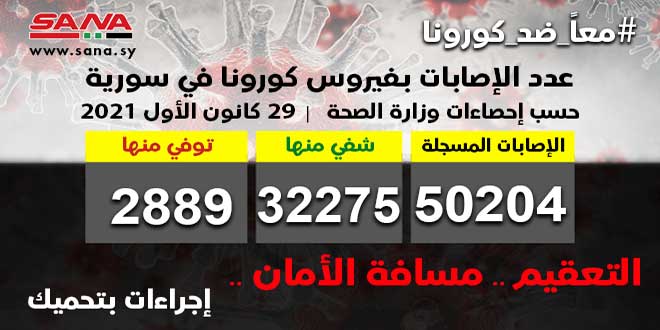 وأوضحت الوزارة في بيان تلقت سانا نسخة منه أن عدد الإصابات المسجلة في سورية بلغ حتى الآن 50204 شفيت منها 32275 حالة وتوفيت 2889 حالة.