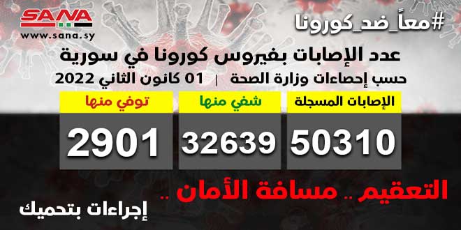 وأوضحت الوزارة في بيان تلقت سانا نسخة منه أن عدد الإصابات المسجلة في سورية بلغ حتى الآن 50310 شفيت منها 32639 وتوفيت 2901 حالة.