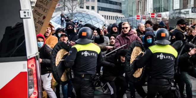 قمعت الشرطة الهولندية اليوم آلاف المتظاهرين الذين احتشدوا في العاصمة أمستردام احتجاجاً على سياسات الحكومة المتعلقة بإجراءات الإغلاق واللقاحات المضادة لوباء كورونا.