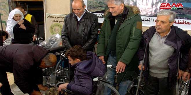 وزع فرع الجمعية السورية للمعوقين جسدياً بالسويداء كراسي ومستلزمات حركية لأشخاص من ذوي الإعاقة وذلك خلال فعالية أقامها اليوم بمقره بمناسبة قدوم العام الجديد تحت عنوان “الحب لا يحتاج لقدمين”.