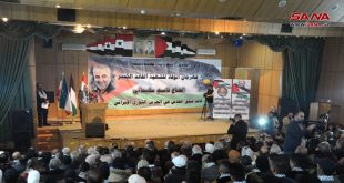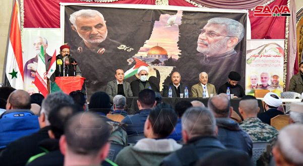 إحياء للذكرى السنوية الثانية لاستشهاد الفريق قاسم سليماني قائد فيلق القدس في الحرس الثوري الإيراني وأبو مهدي المهندس نائب رئيس هيئة الحشد الشعبي العراقي ورفاقهما أقامت فصائل المقاومة الفلسطينية اليوم مهرجاناً خطابياً في بلدة السيدة زينب في ريف دمشق.