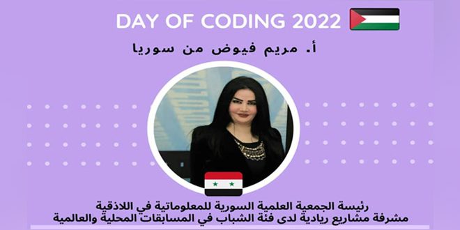 حضور متميز حققته سورية ممثلة بالجمعية العلمية السورية للمعلوماتية فرع اللاذقية في فعالية يوم الجائزة العالمية للبرمجة المنظم من قبل وزارة التربية في فلسطين بعد أن حلت ضيفاً رسمياً ومتحدثا رئيسياً في الفعالية التي أقيمت تزامناً مع الاسبوع العربي للبرمجة الذي تنظمه منظمة التربية والتعليم التابعة لجامعة الدول العربية الألسكو.