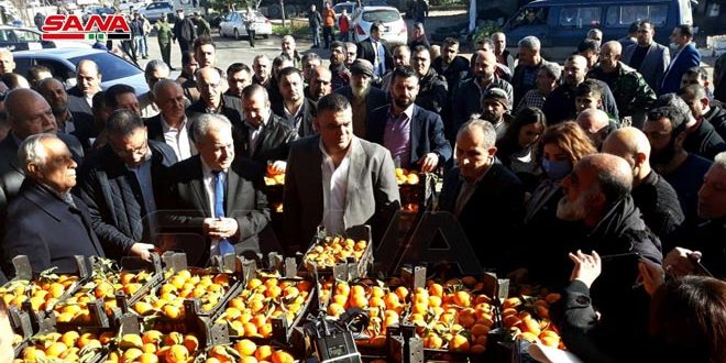 تفقد رئيس مجلس الوزراء المهندس حسين عرنوس والوفد الحكومي المرافق سير إجراءات تسويق محصول الحمضيات من خلال المؤسسة السورية للتجارة في إحدى المزارع في سهل جبلة بريف اللاذقية.